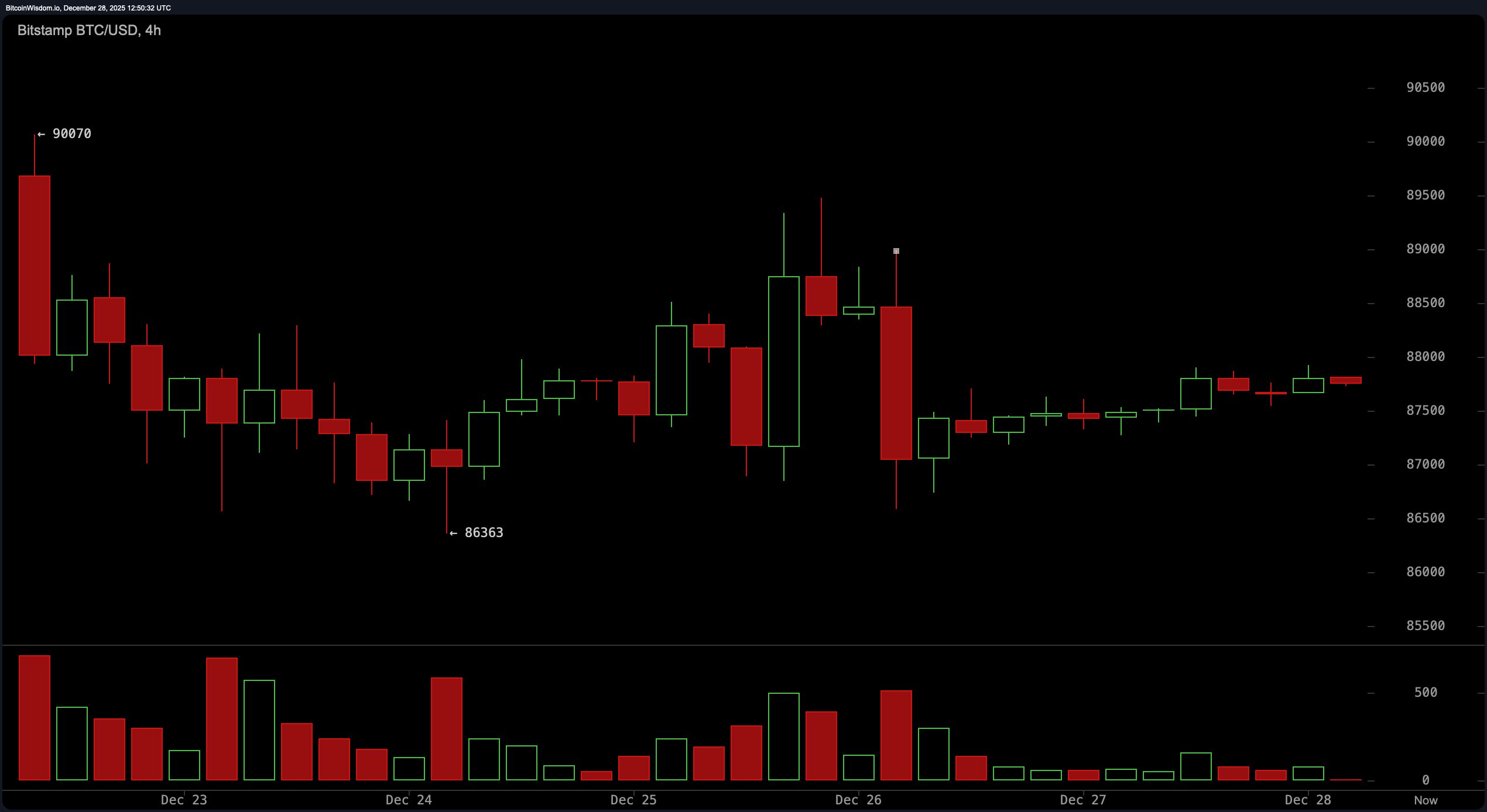 Пробой выше $88 000 или падение ниже $87 200 может сигнализировать о следующем движении. Или нет. 🤷
