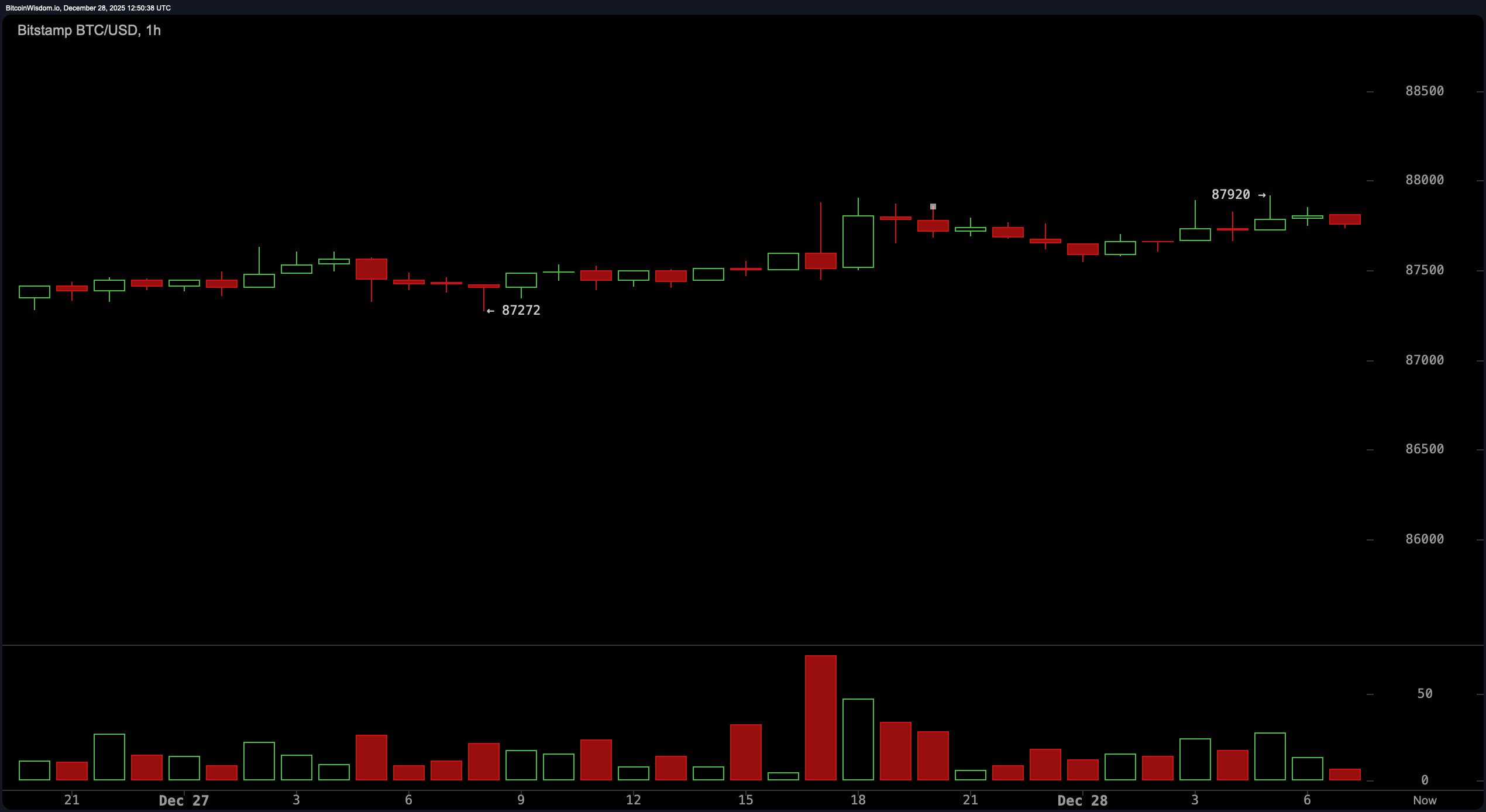 Bitcoin торгуется по цене $87 752 по состоянию на 28 декабря 2025 года. Зевок. 😴 - Растёт или падает Биткоин сегодня?